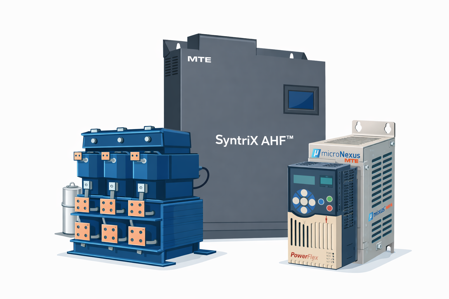 MTE provides simple, robust power quality solutions. Power quality management requirements differ significantly by utility, industry, application and country. MTE offers many power quality and filter products for both input (line-side) and output (load-side) of variable frequency drives (VFDs) and power conversion equipment. These components represent strategic elements of power quality. MTE provides complete power quality solutions for automation in oil and gas, water/wastewater, HVAC and other industries.